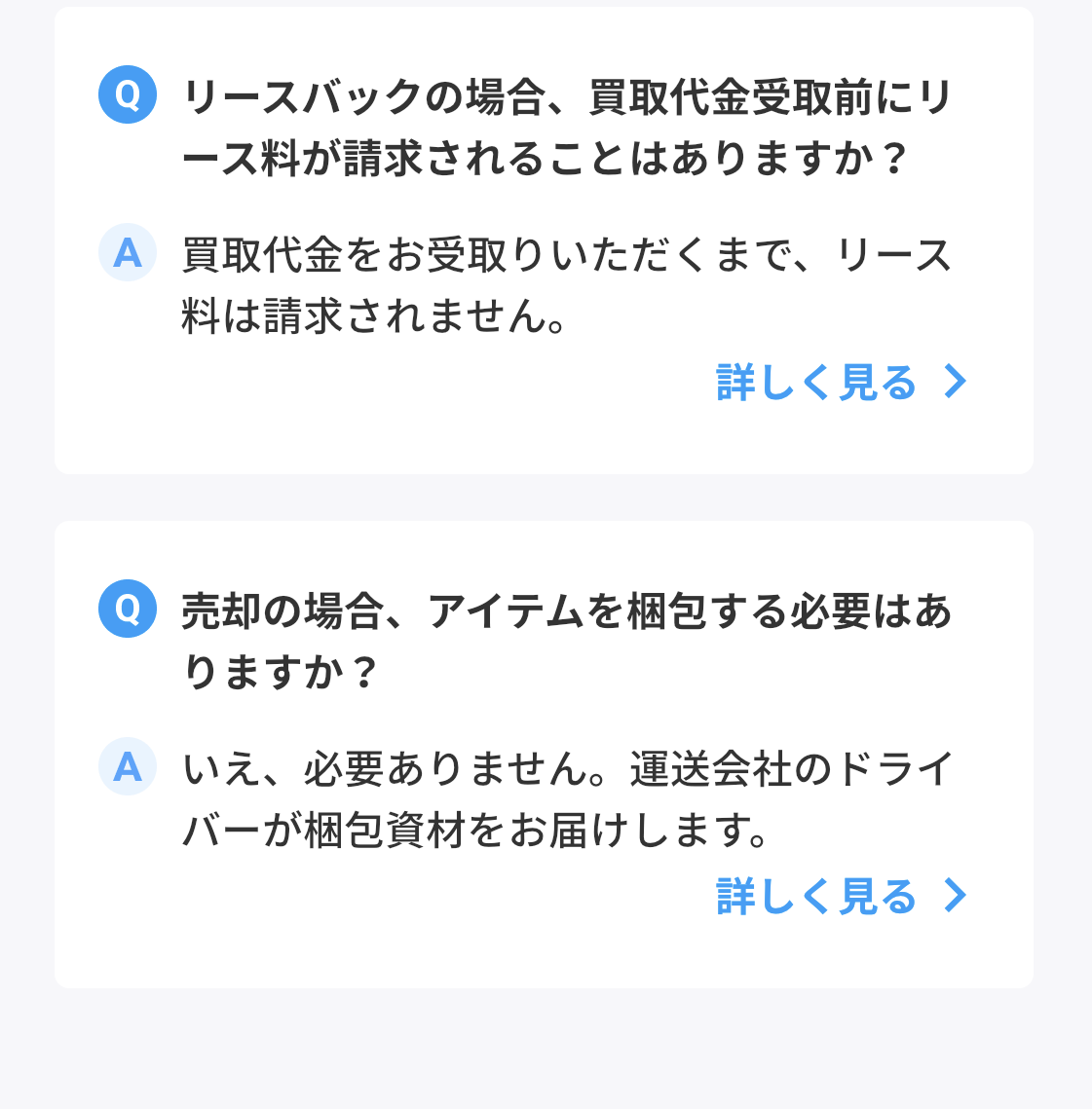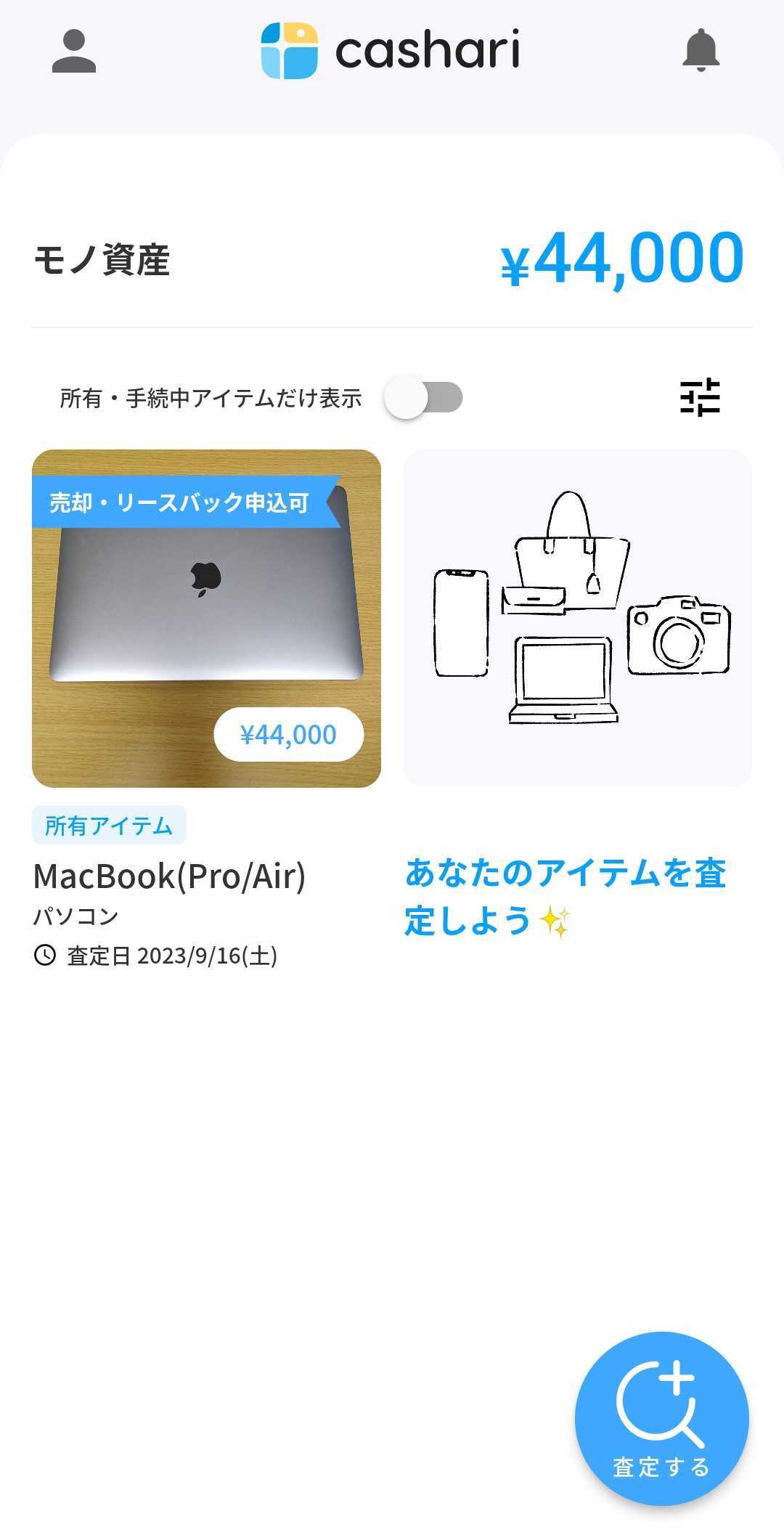 アプリを開き、トップ画面に表示された"売却・リースバック申込可"のアイテムから、リースバックのお申込みを希望するアイテムを選択します。