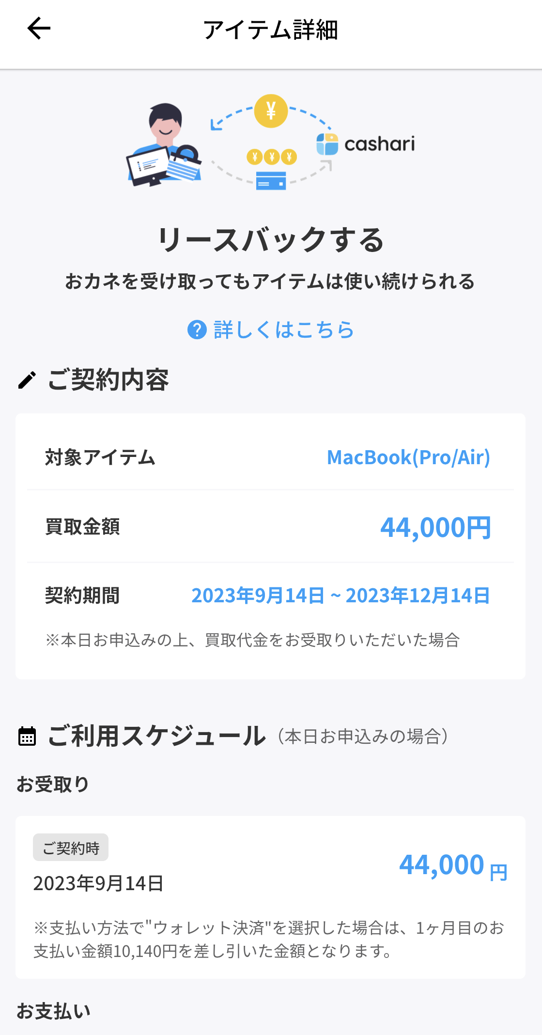 ウォレットとは、カシャリを通じて開設するGMOあおぞらネット銀行の専用支店口座で、アプリと連携してリース料のお支払い・買取代金のお受取りにご利用いただけます。