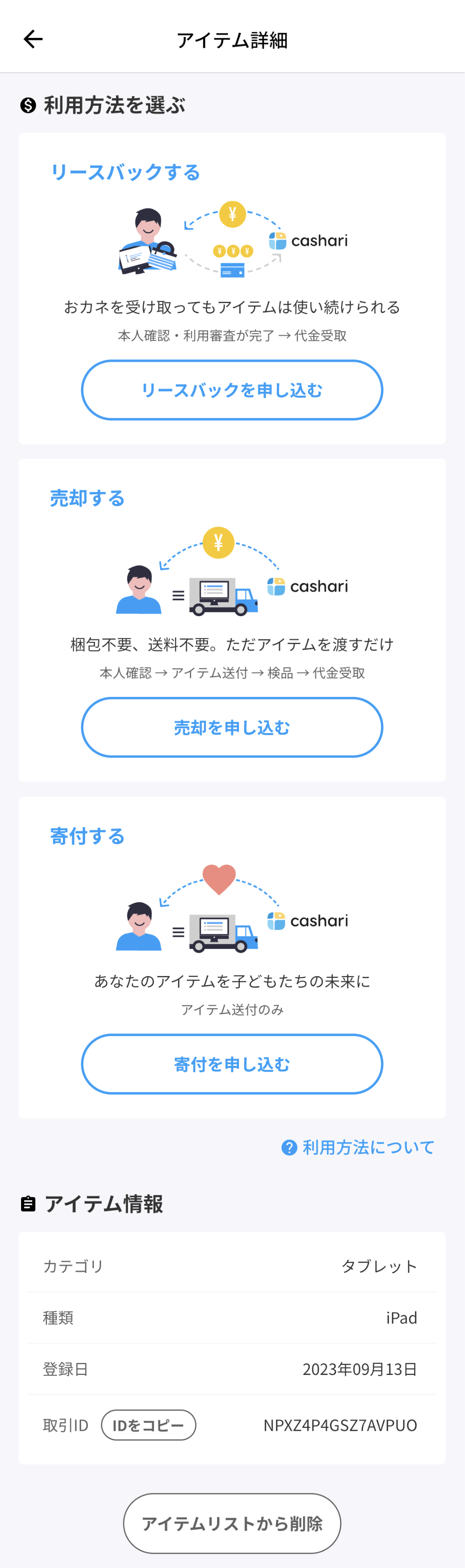 契約期間中でも、アイテムを手放すことによって、利用契約を終了することができます。 この場合、残りの金額をお支払いいただく必要はありません。 カシャリのアプリから、以下の手順にてお手続きください。