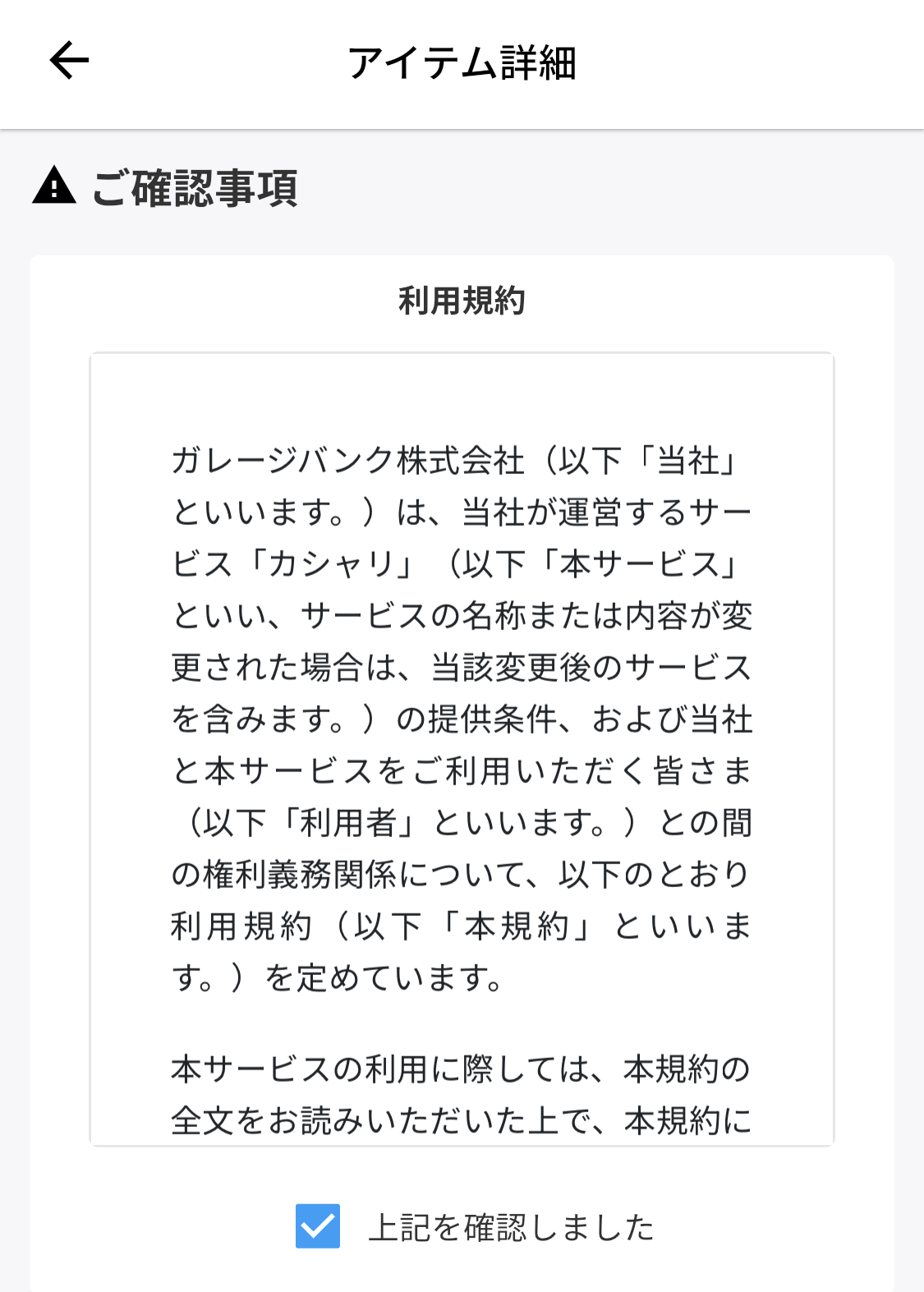 また、アイテムを手放すにあたり、ご注意いただきたい事項が表示されます。表示される内容はアイテムごとに異なりますので必ずご確認ください。