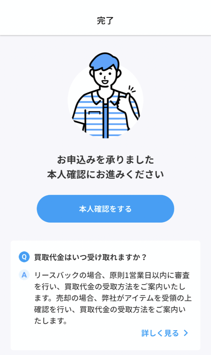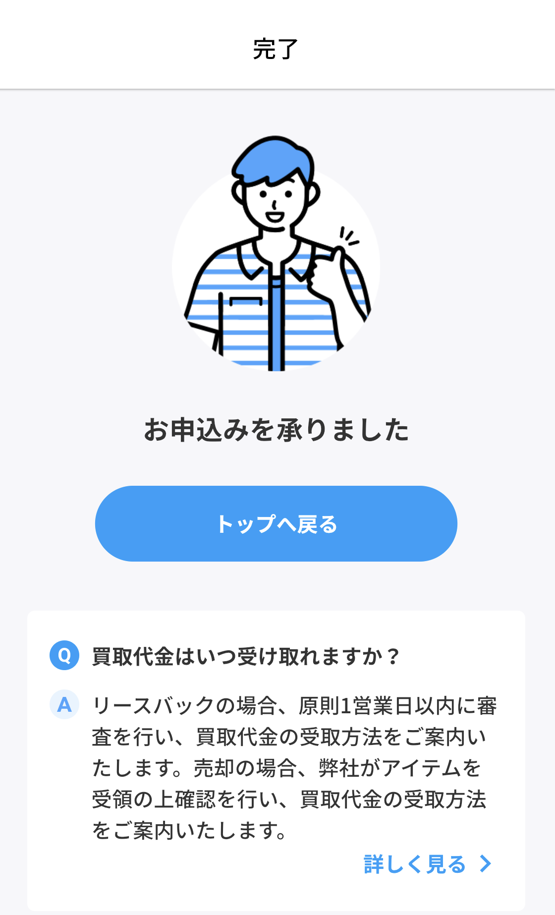 以上で、集荷手続きが完了しました。ご指定の日時に配送業者が梱包資材を持参しアイテムの回収に伺います。