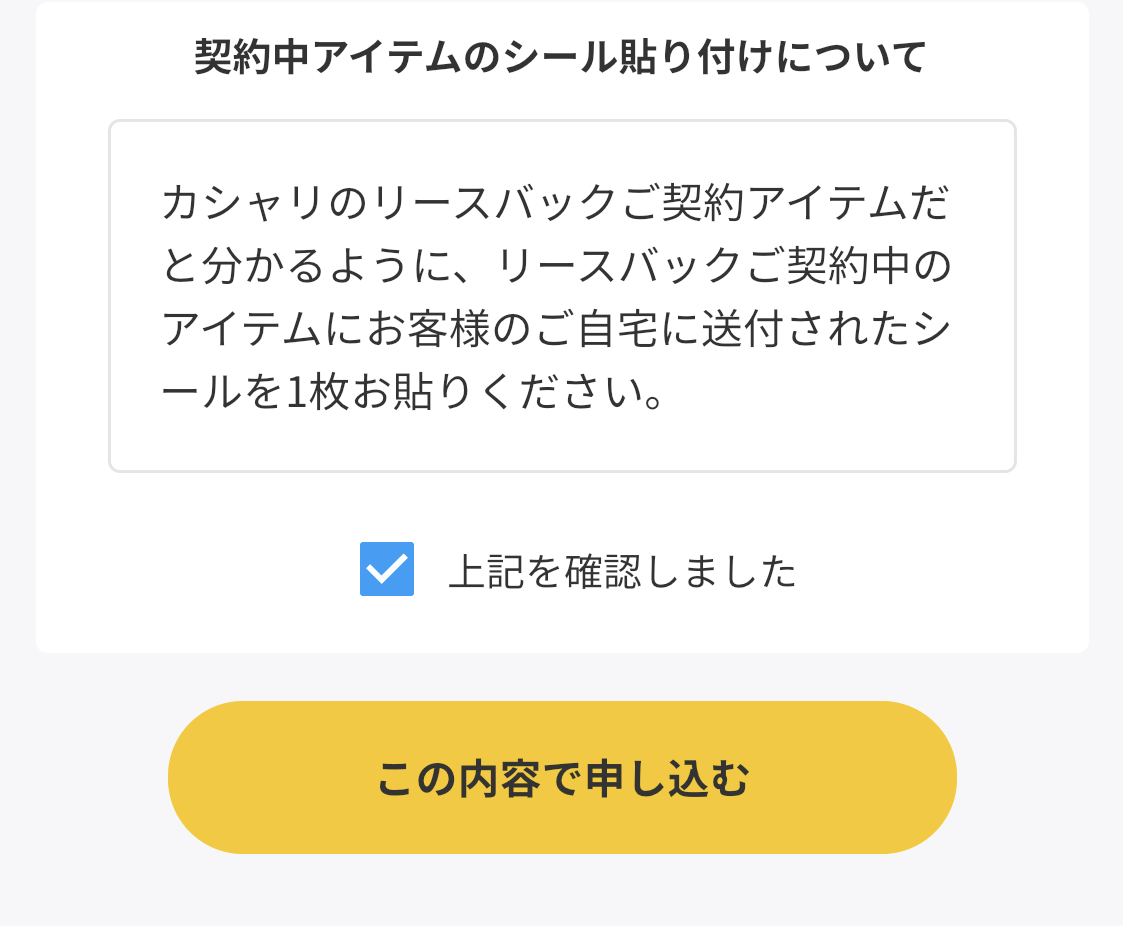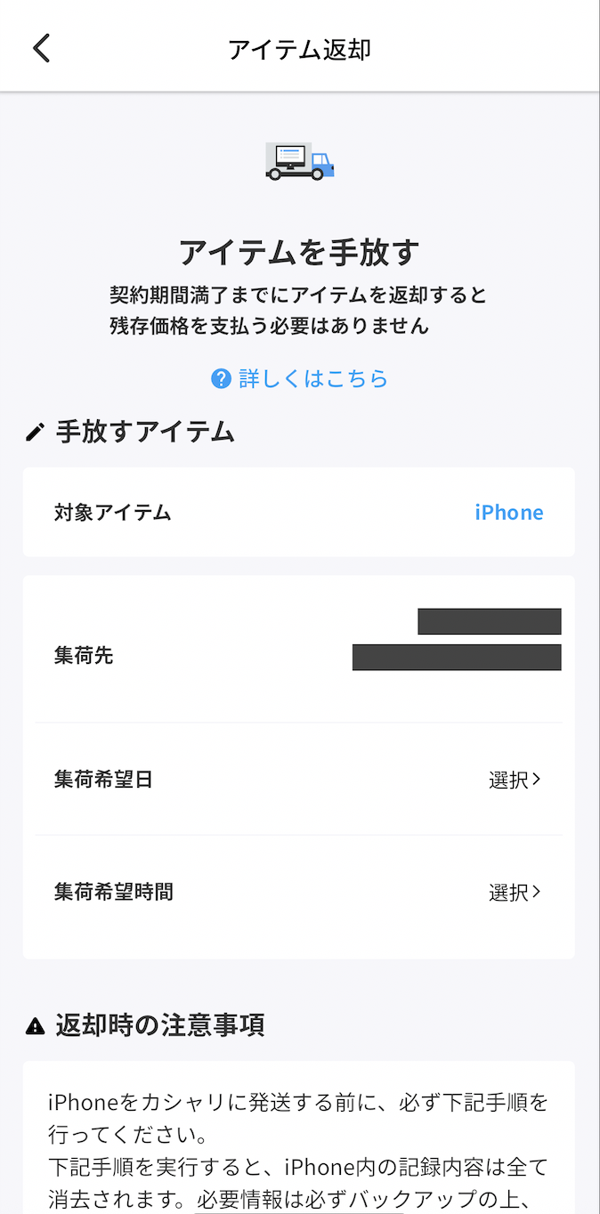 アイテムを手放すことで、残存価格の支払をすることなく、契約を満了させることができます。 本操作に従いアイテムを発送する場合、送料は無料です。 配送業者(ヤマト運輸)が梱包資材を持参の上、ご希望の日時にご登録住所まで回収に伺います。発送するアイテムと付属品をご準備いただき、集荷をお待ちください。
