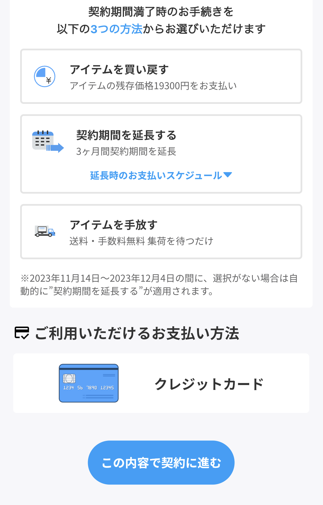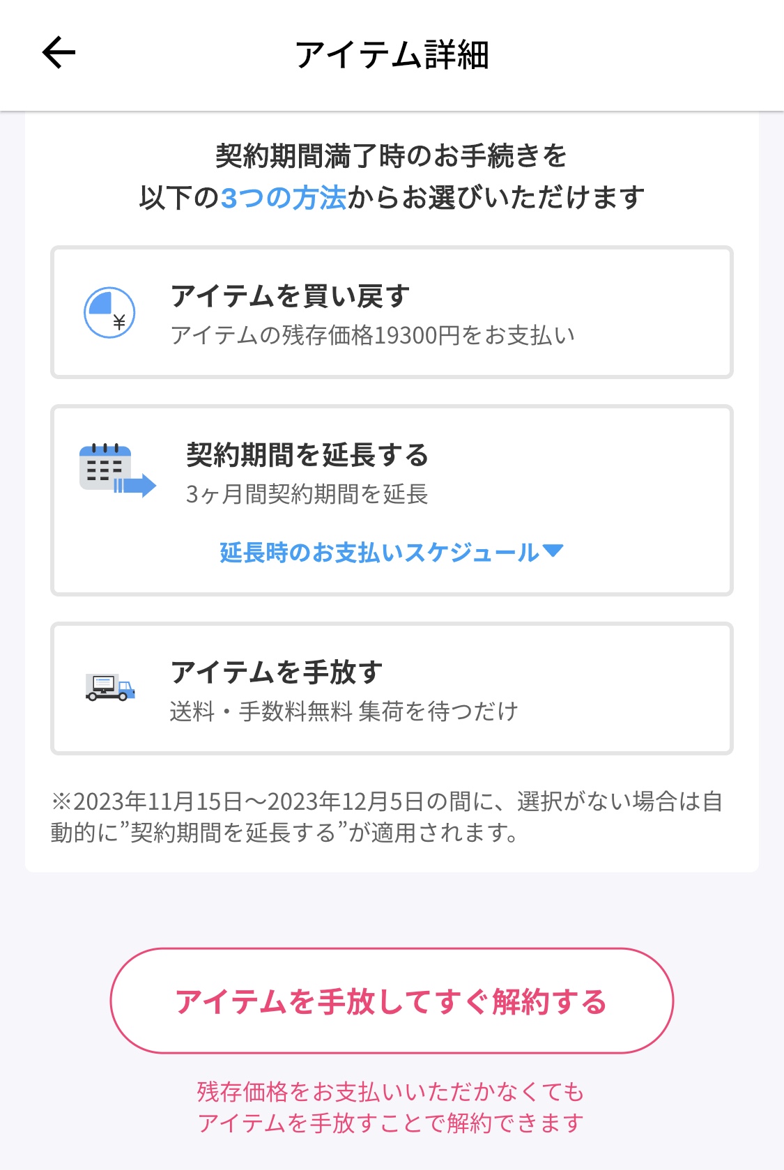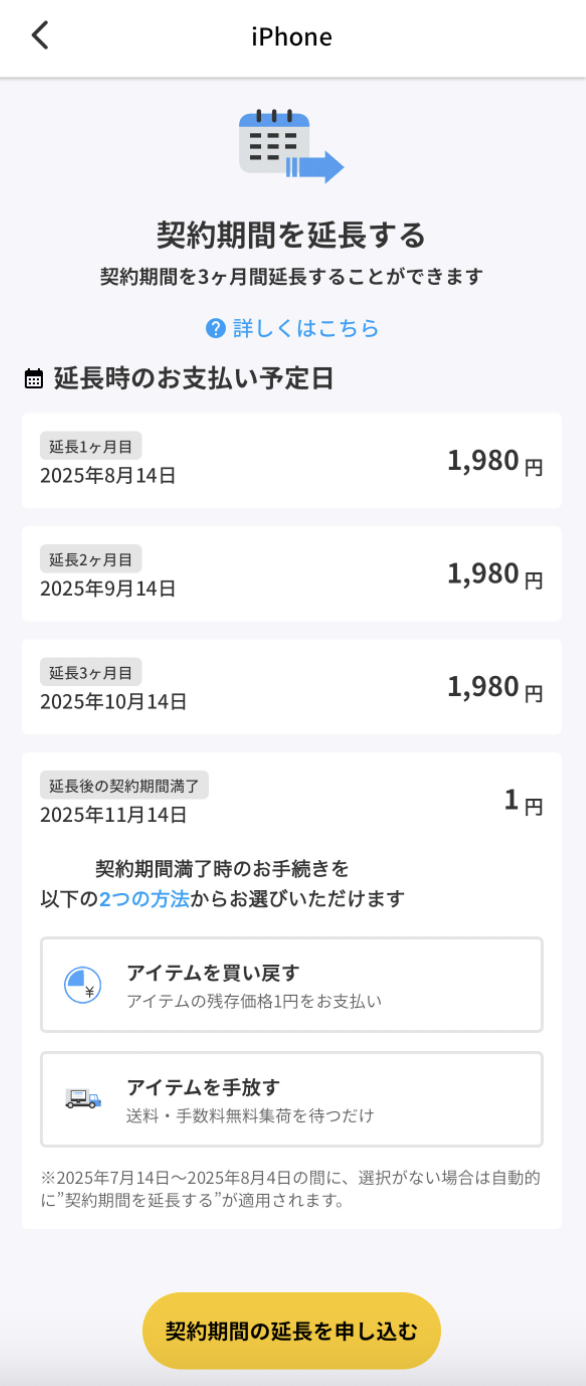 延長期間が終了する際、一律1円を支払いアイテムを買い戻すか、もしくはアイテムを手放すことにより契約を満了させることができます。さらに延長することはできませんのでご注意ください。