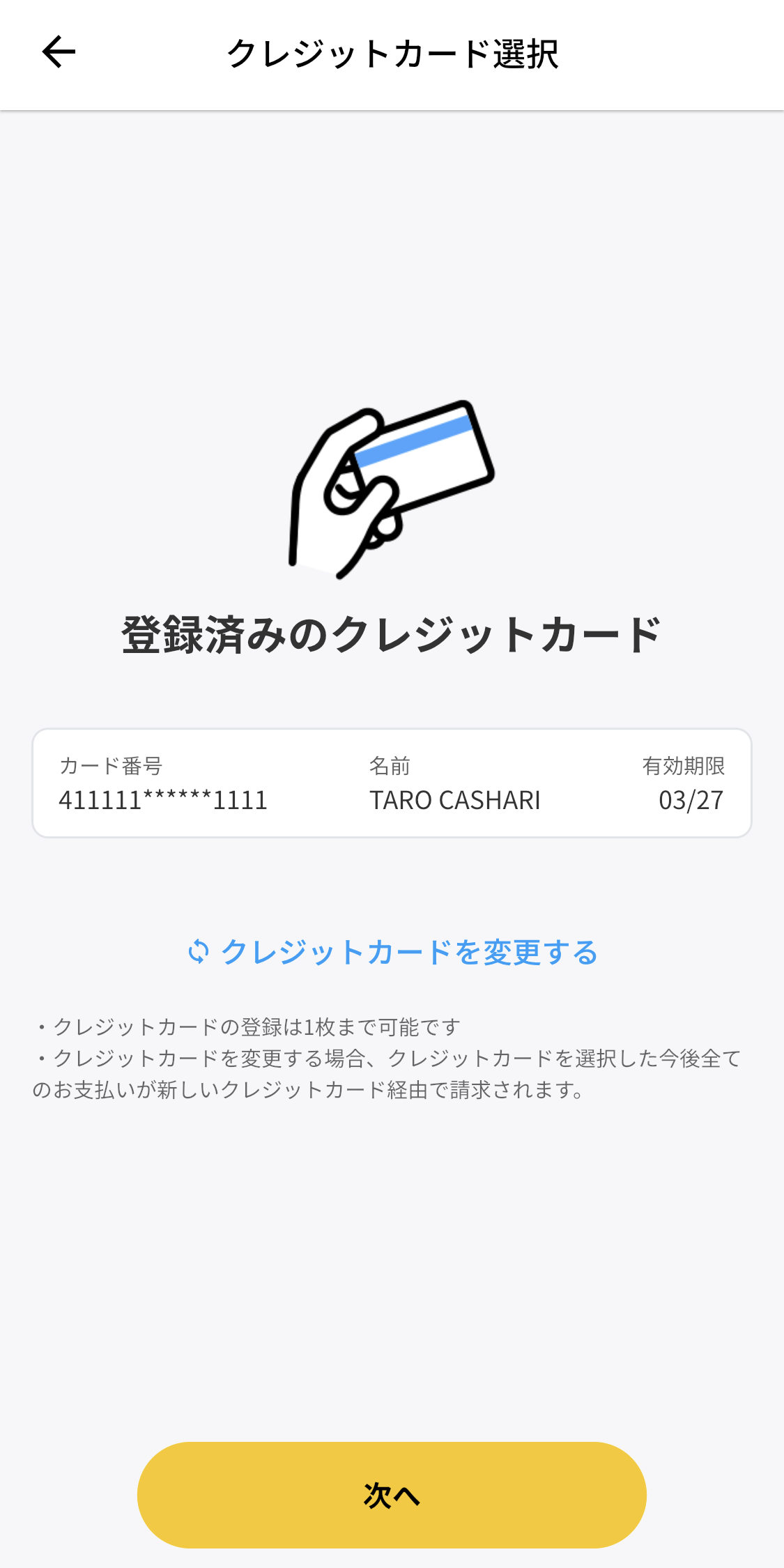 クレジットカードにてお支払いいただく場合、あらかじめ登録済みのカードが表示されます。別のカードを指定する場合は、アプリマイページの"クレジットカードの登録・確認・変更"より、カード情報を変更してください。