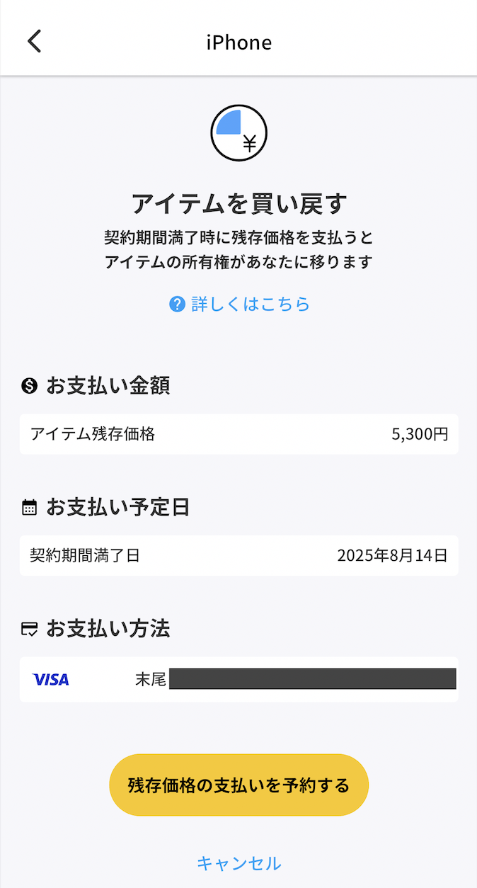 "残存価格の支払いを予約する"を押下いただくとお支払いが完了し、利用契約が終了します。