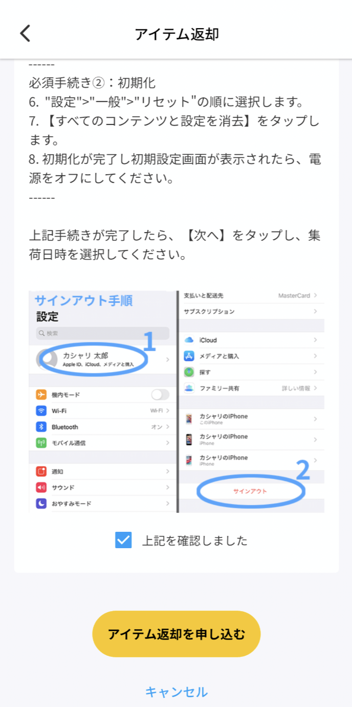 注意事項とご指定の内容をお確かめの上、お間違いなければ「上記を確認しました」にチェックを入れ、"アイテム返却を申し込む"を押下してください。