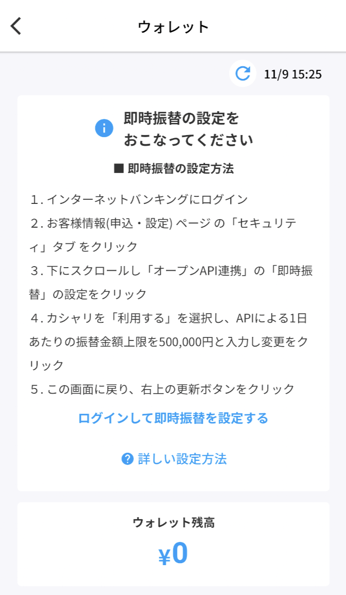 ウォレットの初期設定、ならびに口座連携までお済みの場合は、以下の操作手順で即時振替の設定をお願いいたします。