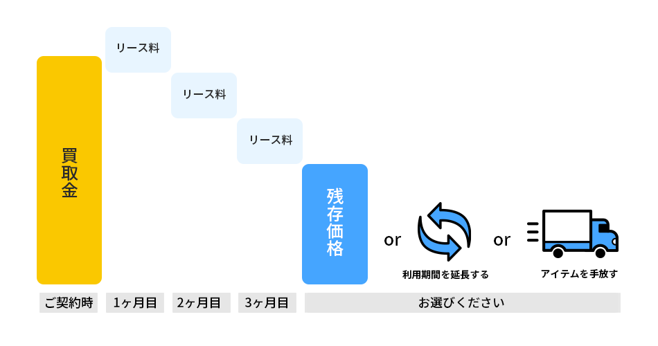 契約期間満了時には、【残存価格の支払によりアイテムを買い戻す】【契約期間を延長する】【アイテムを手放す】からご選択いただきます。